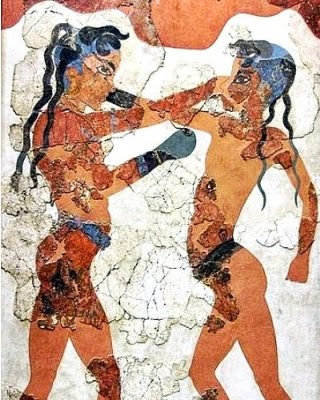 Bare knuckled boxing was also the norm in Egypt, as depicted on a sculpture from around 1350 BCE from Thebes (modern-day Luxor). It shows spectators watching three sets of fighters and what is interesting is that they seem to be performing for the pharaoh. The earliest representation of ancient boxing gloves in use comes from a Minoan fresco (pictured above) from Thera (modern-day Santorini) which is commonly known as the Boxing Boys and dates from around 1600 BCE.