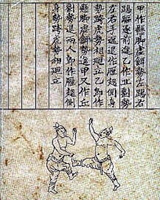 Confucianism replaced Buddhism as the main religion in Korea during the Yi Dynasty (1392 – 1910) and brought with it the idea that the ruling elite should concern themselves with soft arts such as poetry and music. The hwarang lost much of their relevance after this, and ultimately there was a ban on various fighting disciplines for everyone except those in the military. Despite this, in 1790 King Chong Jo commissioned one of his generals, Lee Duk Mu, to write an illustrated book to preserve the techniques of Korean martial arts. The book was called the Muye Dobo Tongji (a page of which is depicted above), and consisted of forty pages that covered soo bahk and taekkyon, as well as giving instructions on the use of weapons.