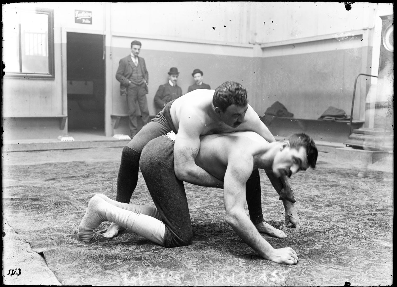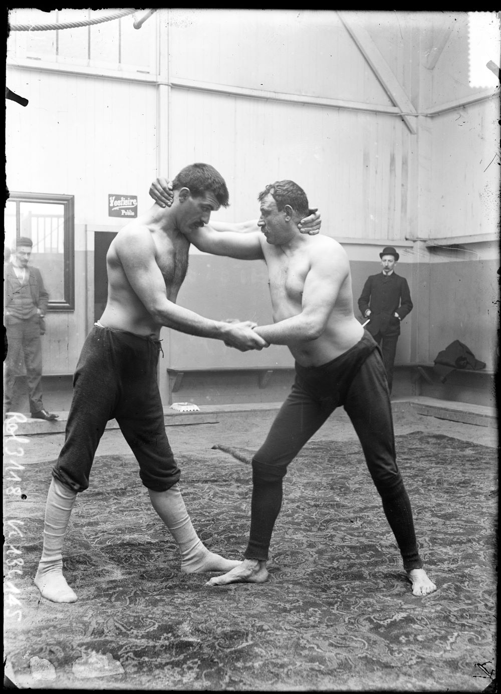 The Frenchman Paul ‘the Colossus’ Pons (1864-1915) who became professional wrestling’s first World Champion in 1898, pictured training with the seven foot giant